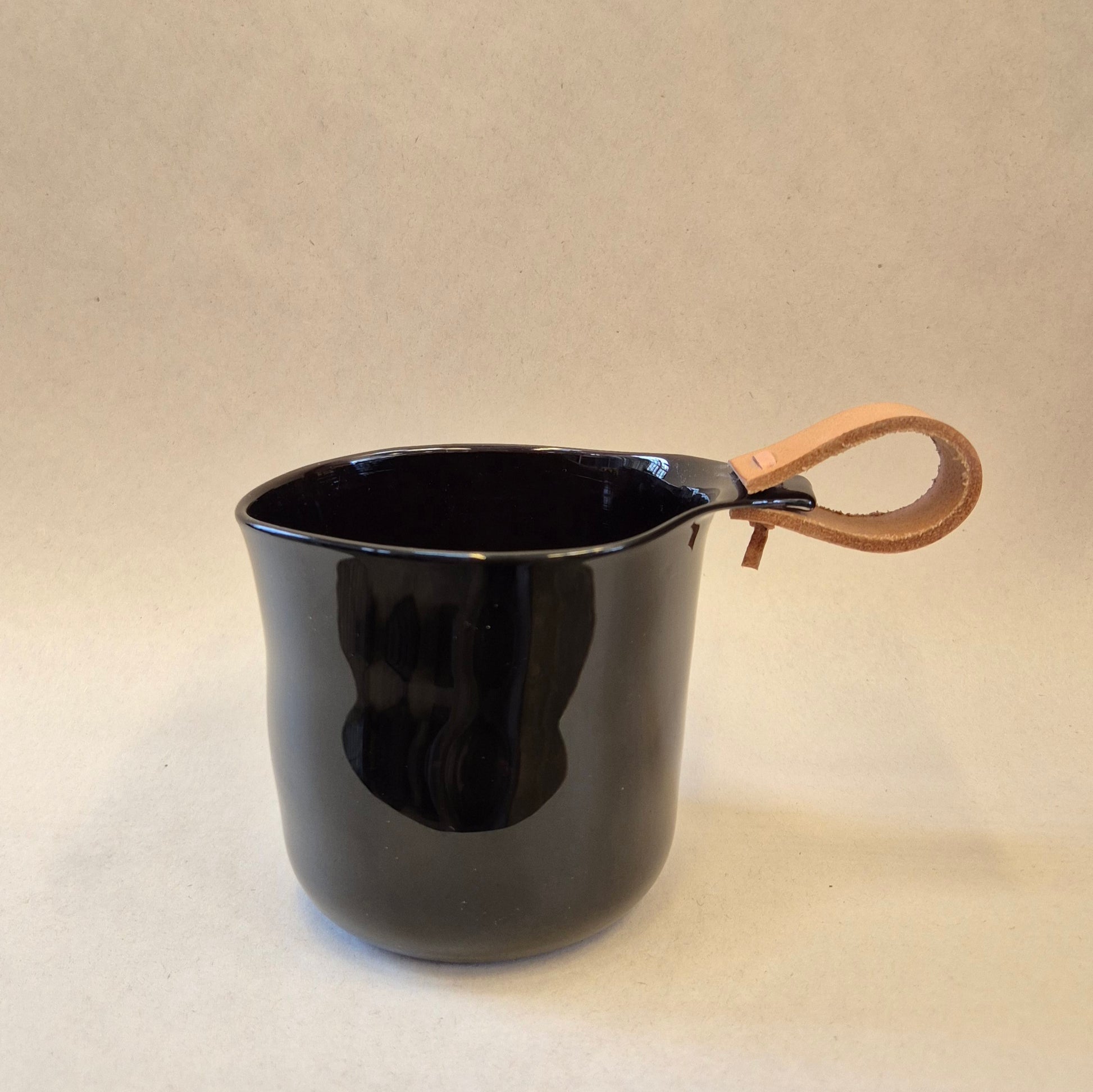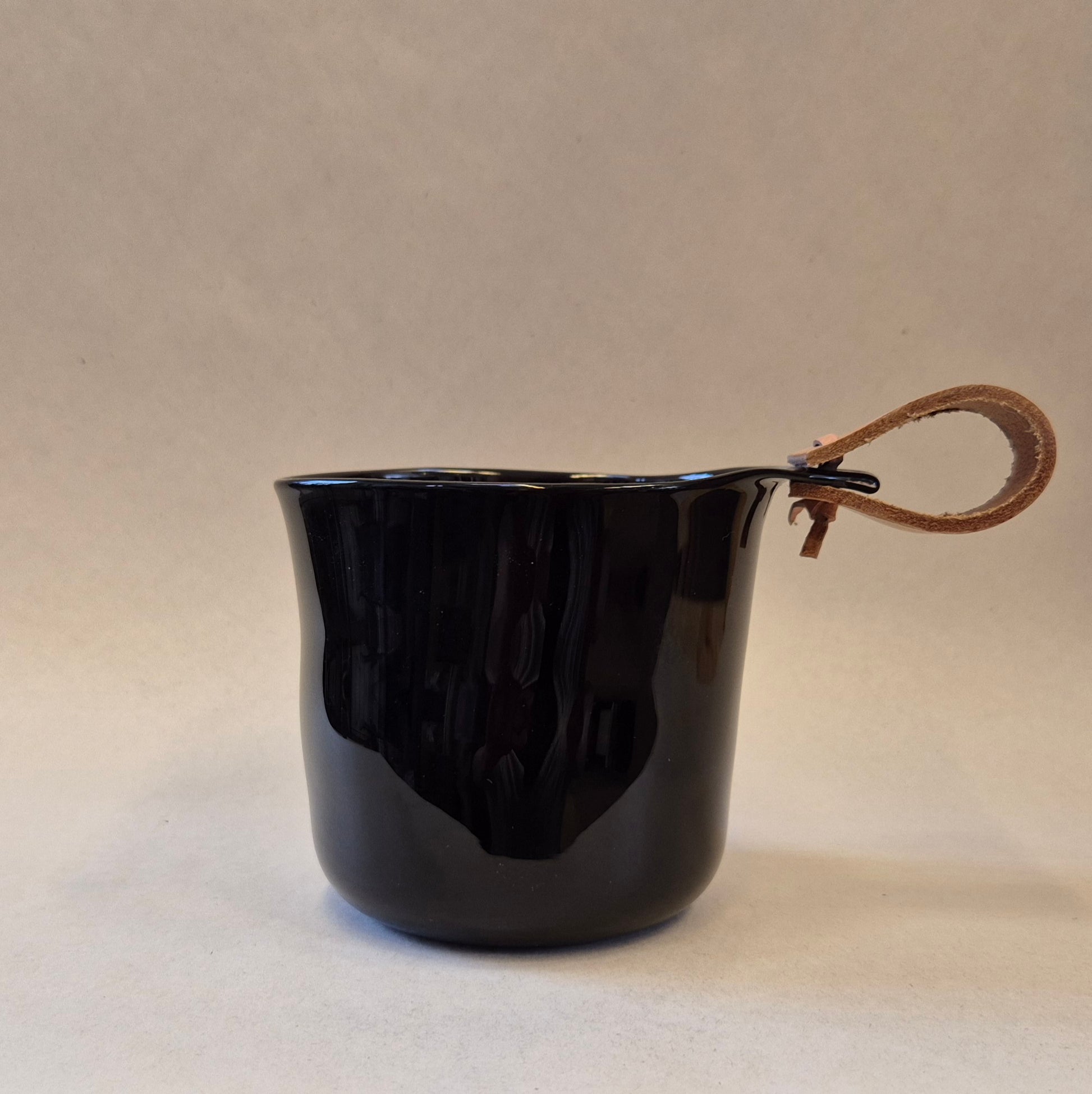 Frihandsblåst kåsa med driven kant och läderrem.