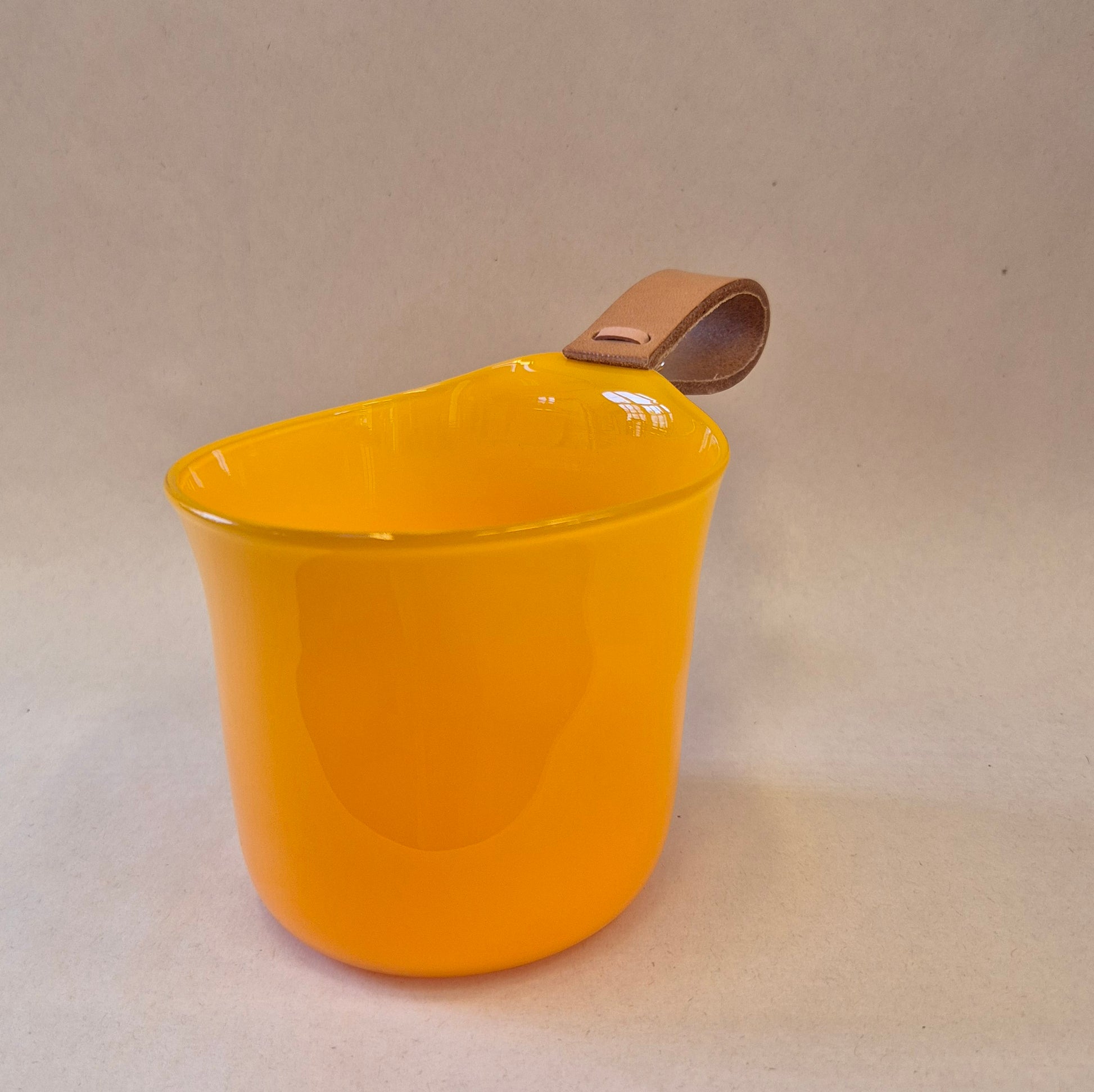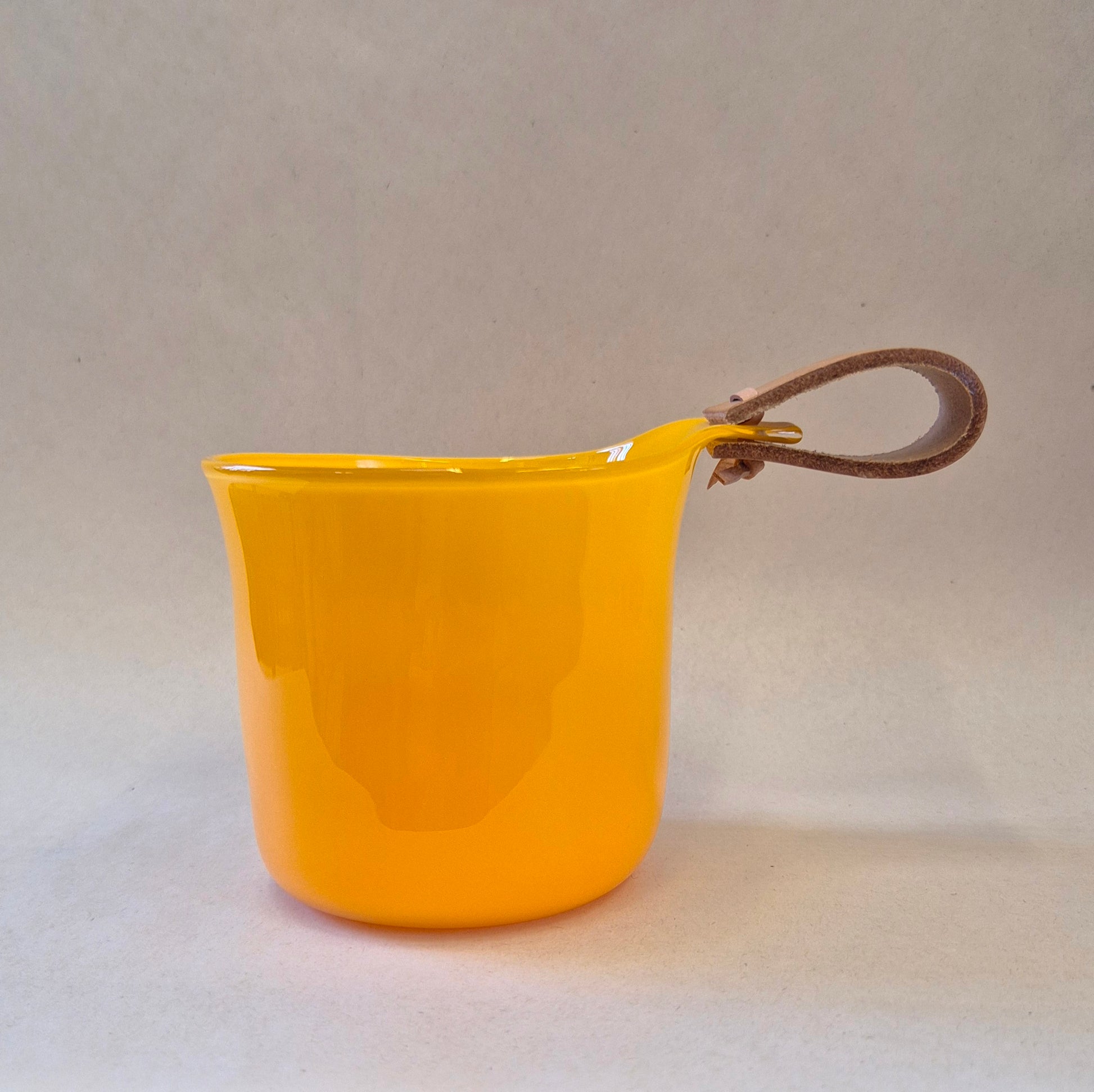 Frihandsblåst kåsa med driven kant och läderrem.