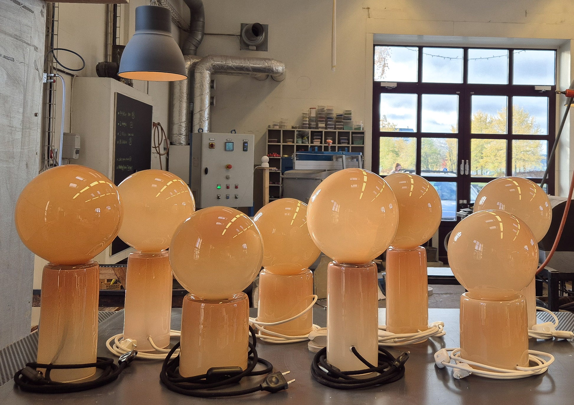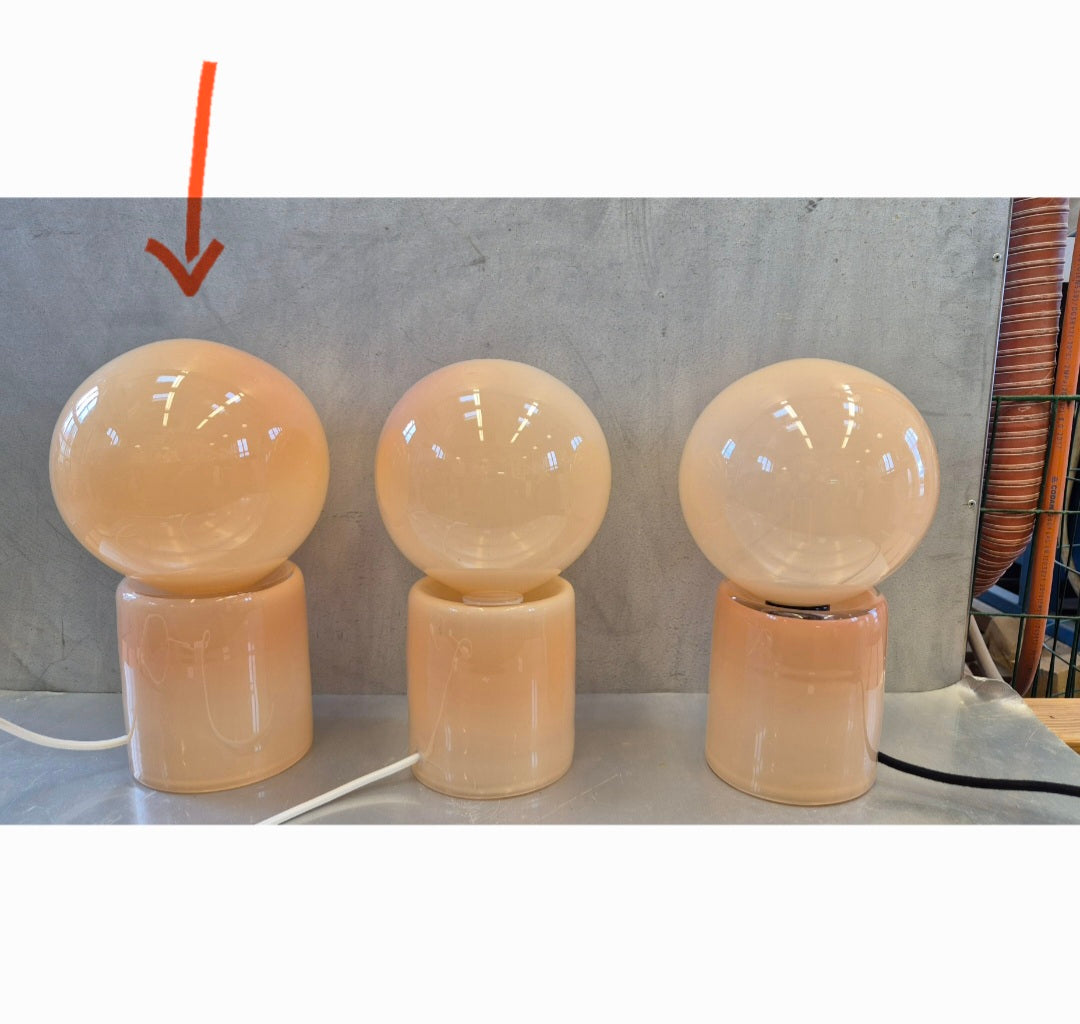 några små blåsor i glaset på kupan och ett "gravyrslint" på sockeln vid sladdhålet, därav prisavdrag.