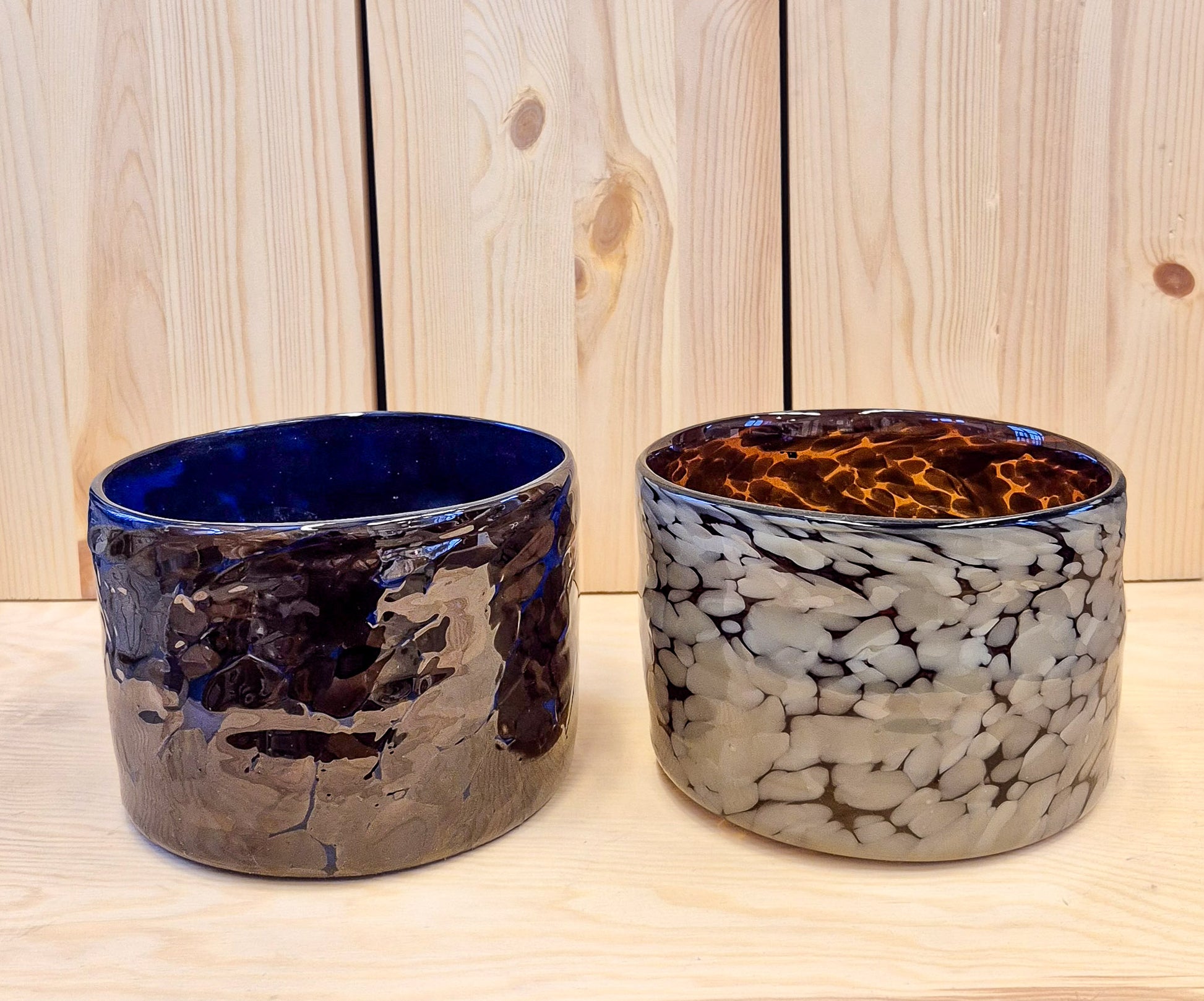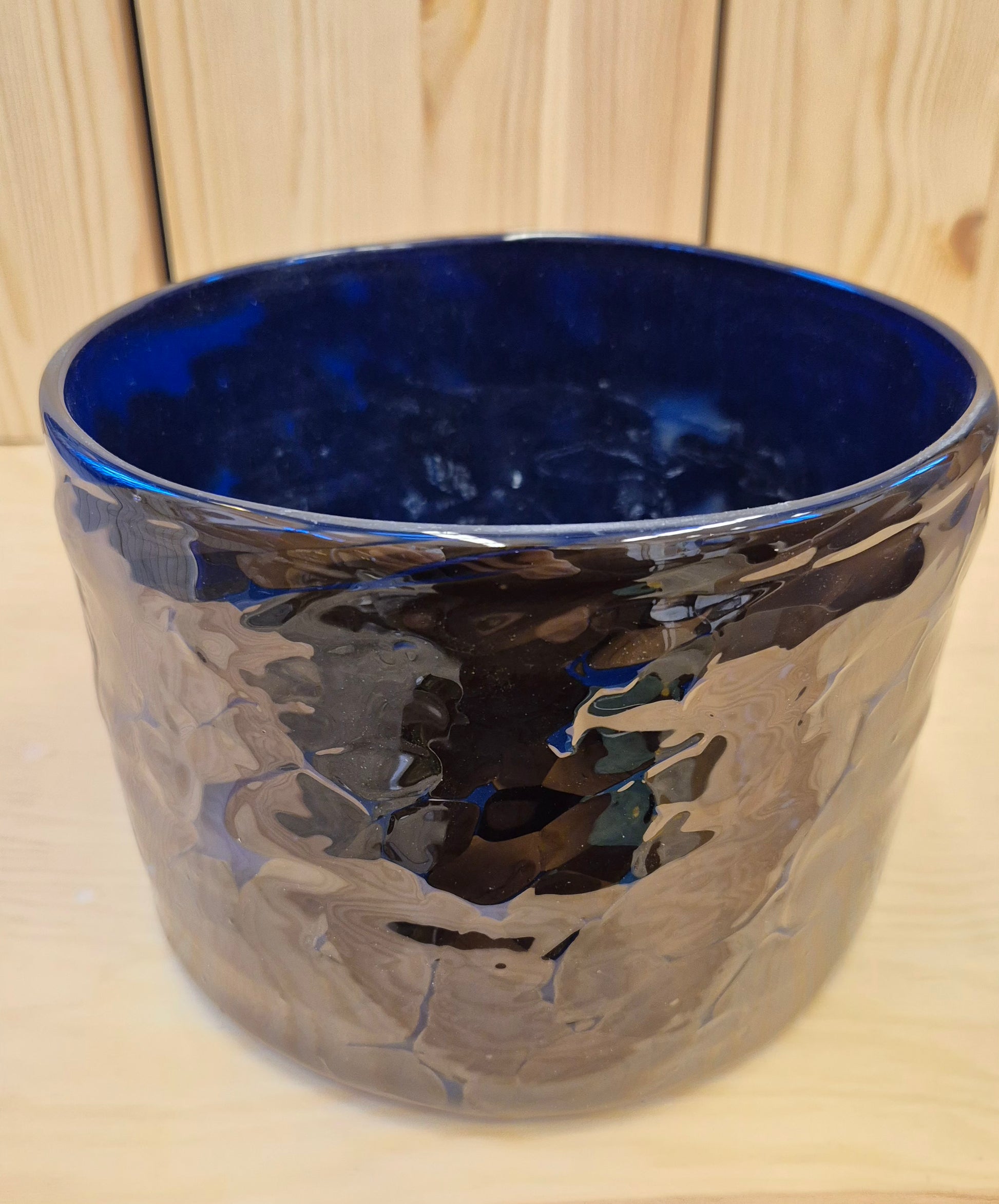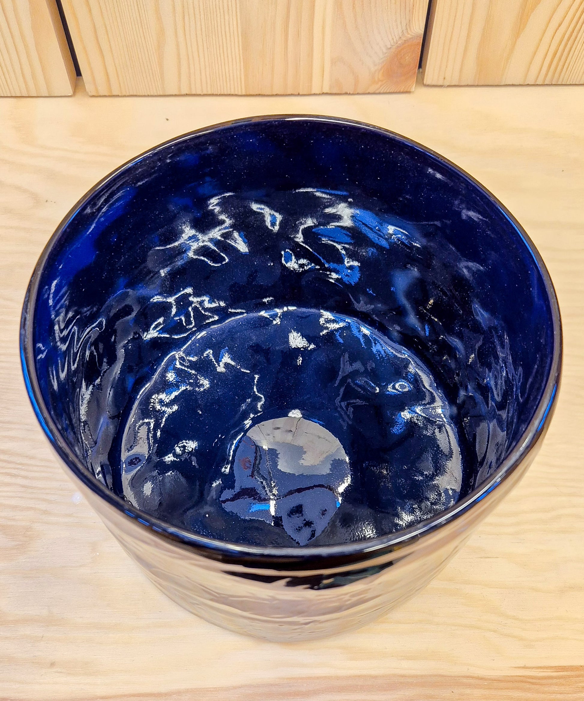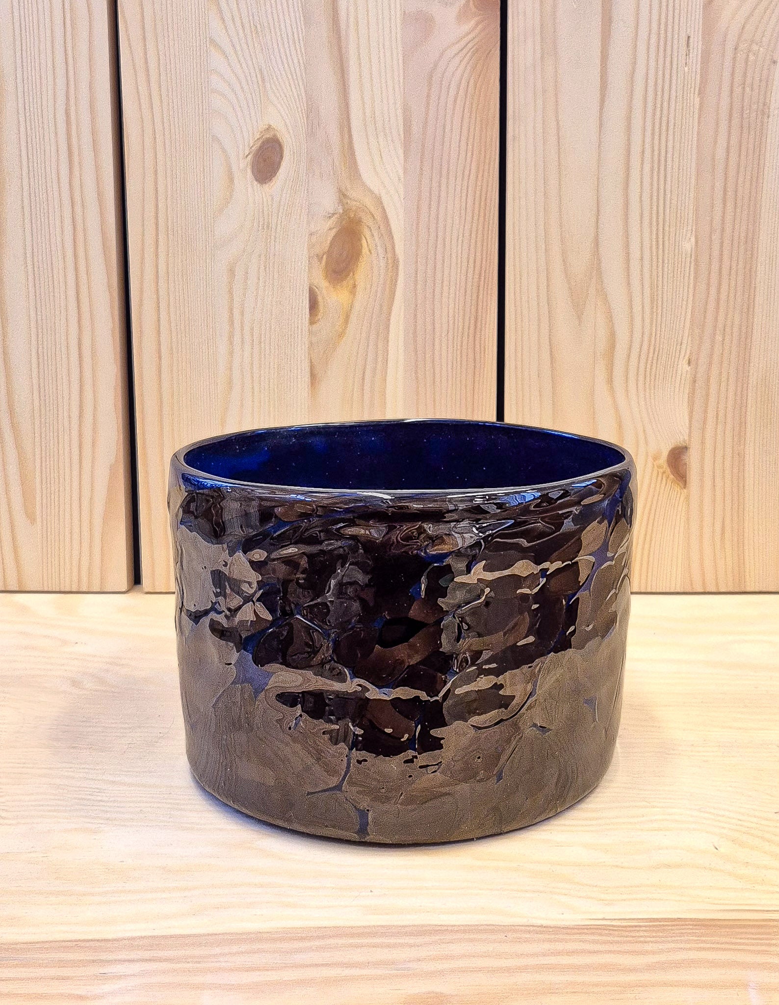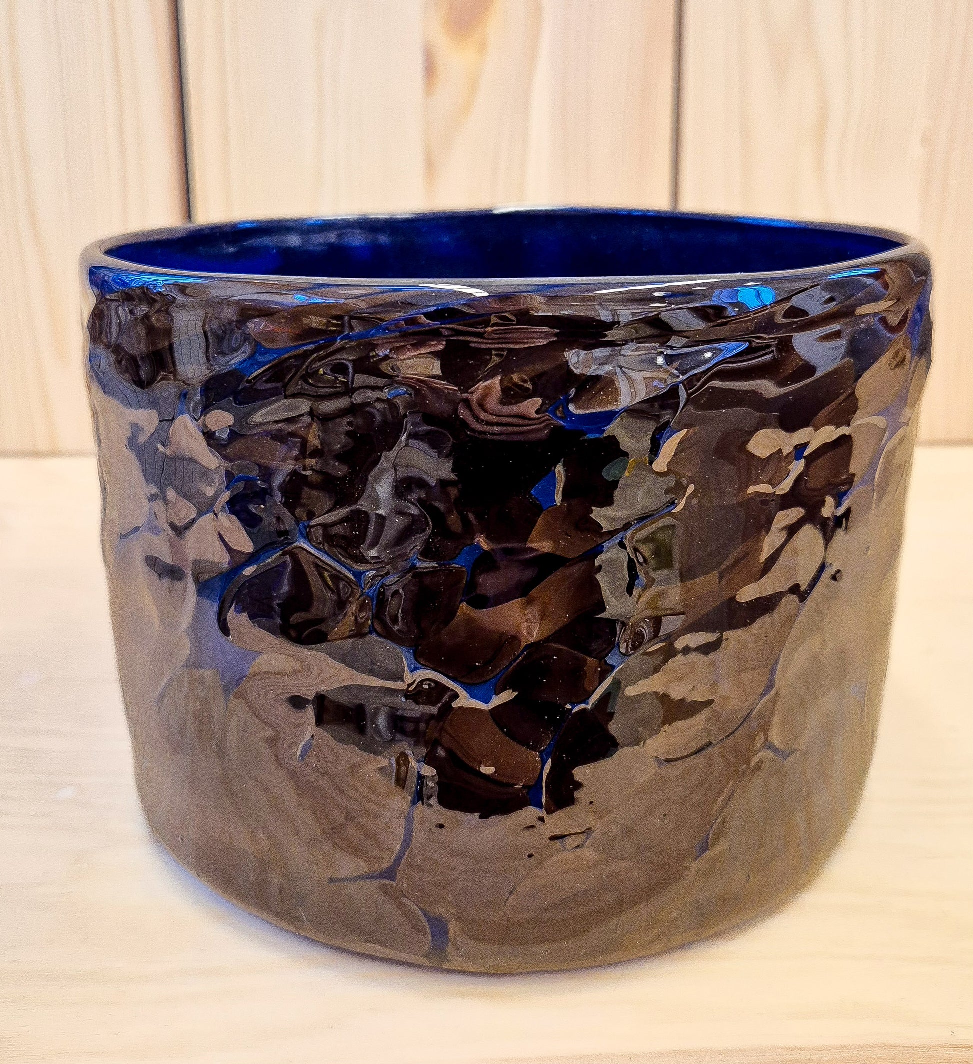 underfång i opak mörkblå, utvändigt stora sammansmälta bruna prickar.